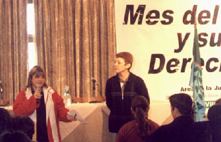 ![]() Carolina Guaita, integrante del Area de la Juventud de la Comuna de Villa Gesell, da inicio al Plenario del proyecto "Los Derechos de los Chicos al Banquillo". A su lado, observa la coordinadora Psicopedagoga Virginia Casas. |