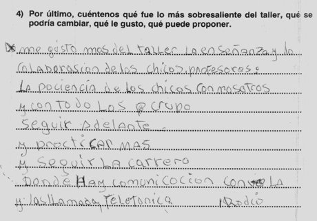 A continuación insertaremos algunas de los testimonios expresados por los talleristas, estas expresiones y el saber que todos los días que se dictan los talleres o se emite el Programa de Radio los participantes llegan a recorrer 6 kilómetros caminando, 20 kilómetros en bicicleta para asistir nos da la certeza del interés puesto por los destinatarios.